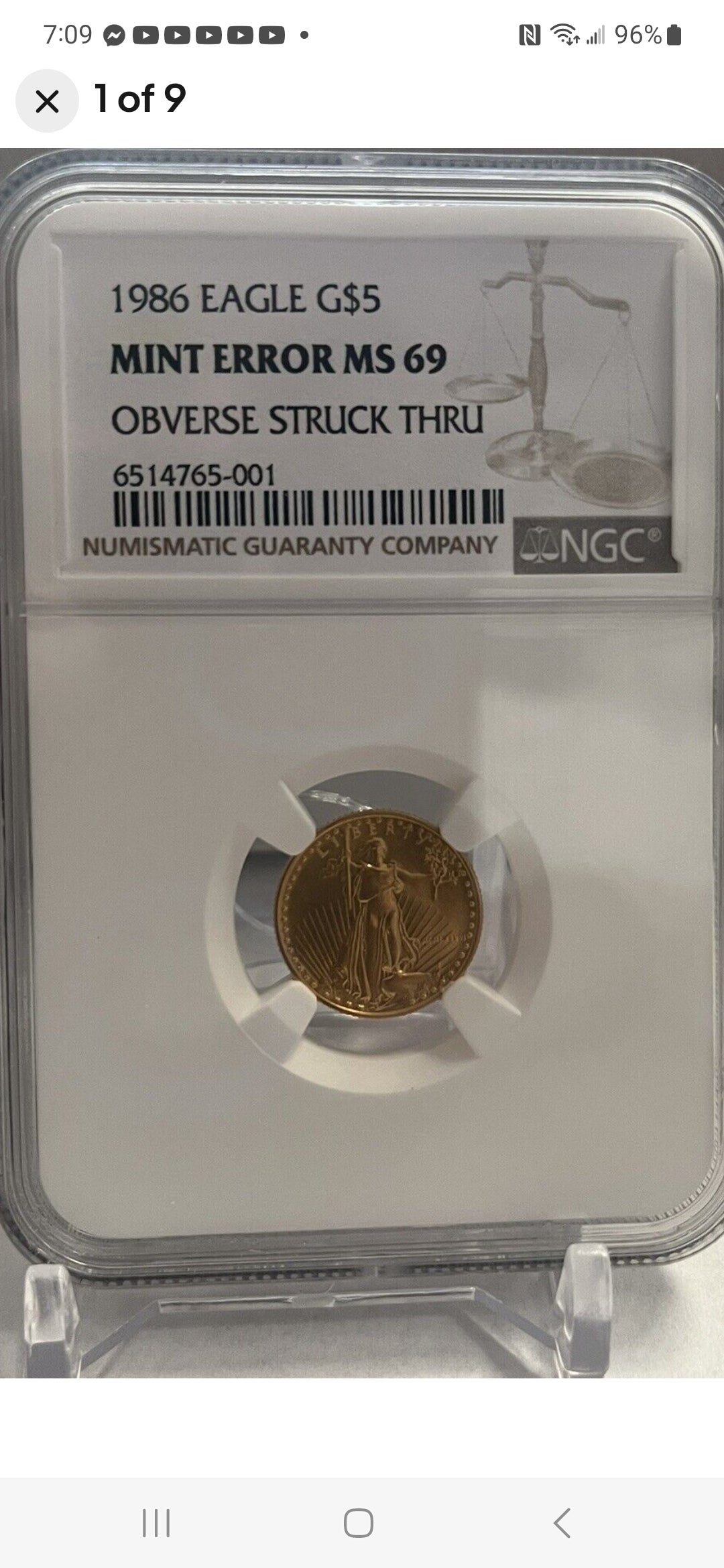 1986 $5 1/10th OZ AGE MS69 MINT ERROR NGC "FIRST YEAR OF ISSUE" MULE- OBVERSE STRUCK THRU - NGC .