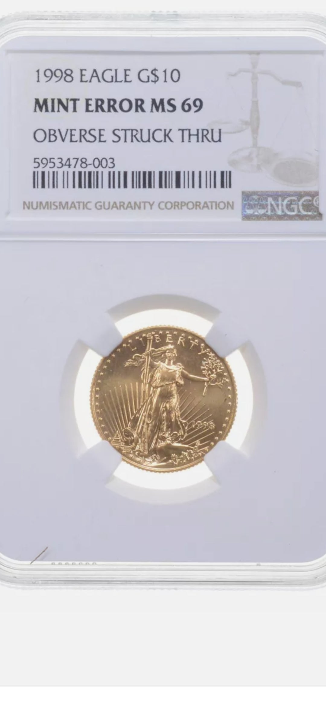 1998 $10 1/4 OZ .999 GOLD EAGLE MS69 MINT ERROR OBVERSE STRUCK THRU NGC-MULE